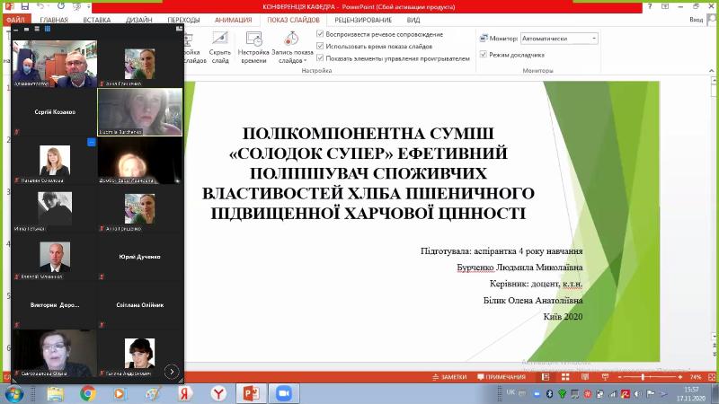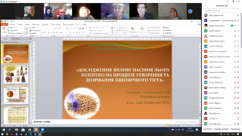 17 листопада в університеті відбулася ІV Міжнародна науково-практична конференція «Інноваційні технології у хлібопекарському виробництві». Зазвичай, кафедра технології хлібопекарських і кондитерських виробів збирає науковців на цей захід щоосені у рамках Всеукраїнського тижня харчових технологій, та цього року, враховуючи карантинні обмеження, конференція відбулася онлайн. Проте, у всьому є свої позитивні моменти. Завдяки використанню сервісу ZOOM, до її роботи змогли долучитися науковці з провідних фахових закладів вищої освіти України, науково-дослідних інститутів, а також колеги зі Жешувського університету та Сільськогосподарського університету в Кракові (Польща), Словацького університету сільського господарства в м. Нітра, Державного університету ім. Акакія Церителі (Грузія).