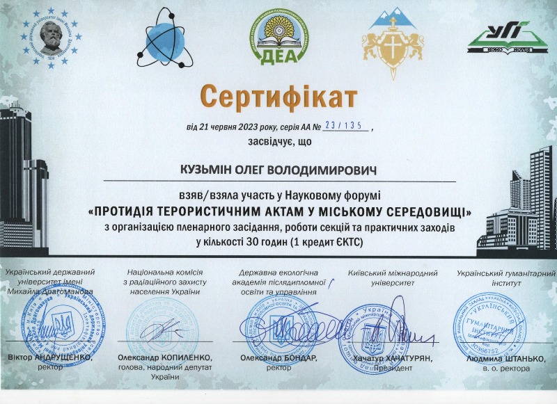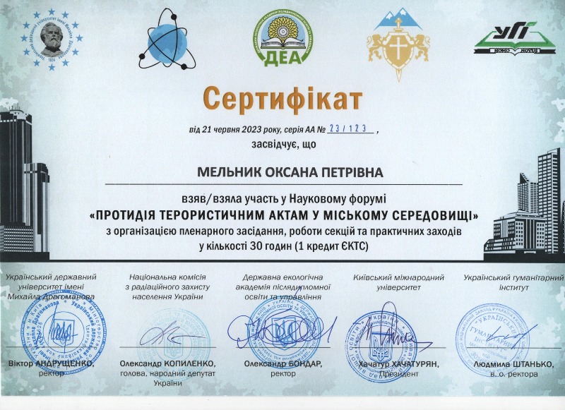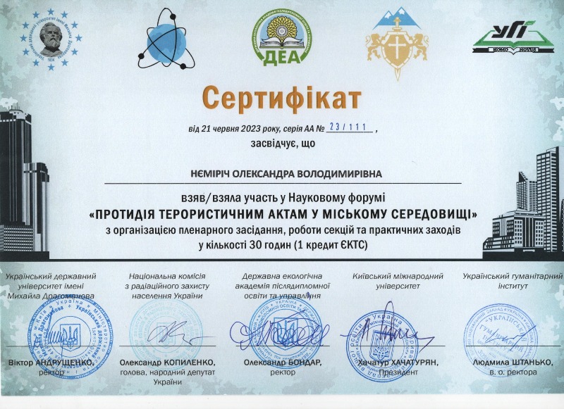 21 червня 2023 року доцентка кафедри експертизи харчових продуктів Оксана Мельник, завідувачка кафедри технології ресторанної і аюрведичної продукції Олександра Нєміріч і професор цієї ж кафедри Олег Кузьмін взяли участь у науковому форумі «Протидія терористичним актам у міському середовищі», що у змішаному форматі відбувся в Українському державному університеті імені Михайла Драгоманова у зв’язку з ймовірністю поширення міського тероризму в Україні (терористичні дії країни-агресора, активізація сепаратистських рухів, зростання рівня злочинності, пов’язаної з обігом вогнепальної зброї, боєприпасів, вибухових і отруйних речовин, недоліки в системі охорони об’єктів критичної інфраструктури, поширення незаконної міграції, небезпечних матеріалів, міжнародної організованої злочинності тощо).