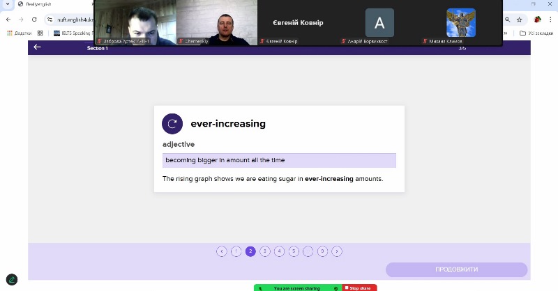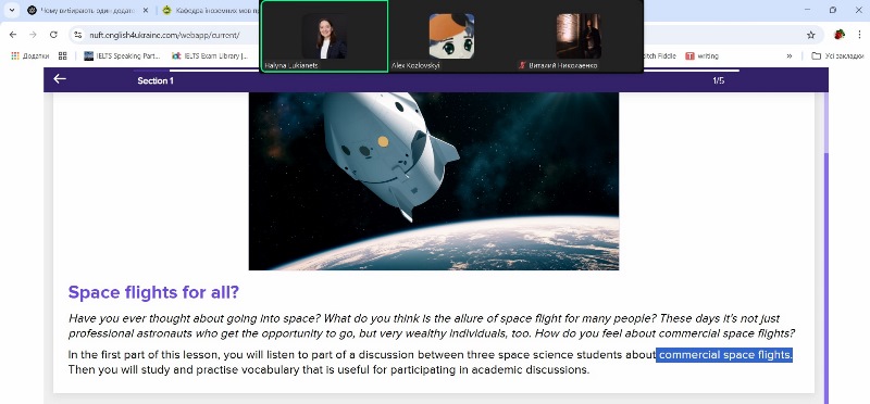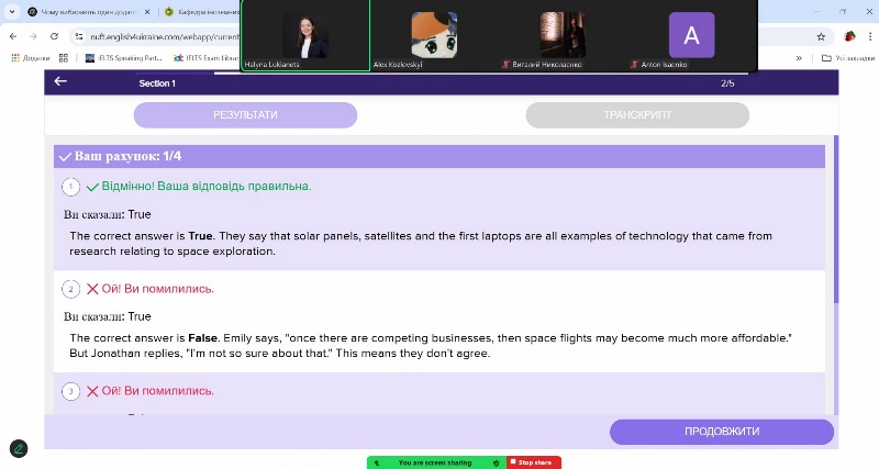 Запропонований навчальний матеріал – цікавий і корисний, а подання інформації інноваційне та свіже. Інтерфейс поданий двома мовами – англійською та українською, що сприяє активному залученню студентів із рівним рівнем володіння англійською мовою. Користувачі платформи особливо відзначили ті завдання і вправи, які стосуються покращення навичок слухання та читання, а також збільшення словникового запасу. Багато наукової термінології англійською мовою було новою для здобувачів, тому опрацювання її з викладачкою виявилося особливо актуальним.