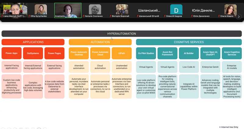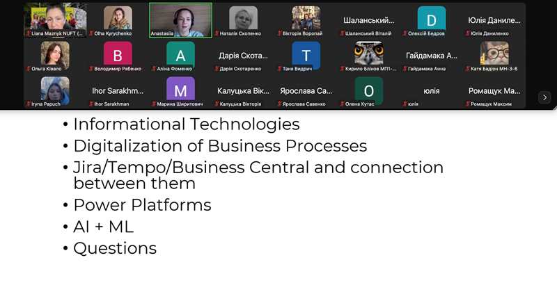 Особливу увагу було приділено практичним інструментам, що використовуються у сучасних проєктних командах: Jira для планування та відстеження завдань, Business Central для управління бізнес-процесами та ресурсами. Учасники дізналися, як ці інструменти допомагають структурувати роботу команди, відстежувати прогрес проєктів і забезпечувати ефективну комунікацію між учасниками. Фахівчиня актуалізувала питання інтеграції конекторів і рішень на базі штучного інтелекту, які допомагають автоматизувати рутинні процеси, аналізувати ефективність командної роботи та оптимізувати прийняття рішень.