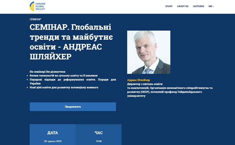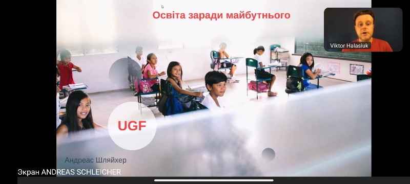Андреас Шляйхер поділився світовим досвідом формування освітніх політик, що орієнтовані не лише на знання, а й на розвиток потенціалу кожного здобувача освіти. Особливу увагу було приділено впливу цифрових технологій на структуру та зміст освітнього процесу, питанням справедливості доступу до освіти, а також навичкам майбутнього, необхідним для сталого розвитку.