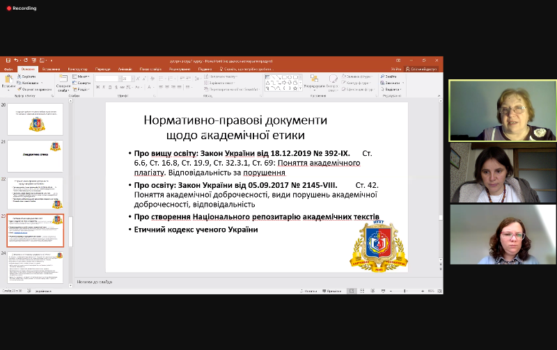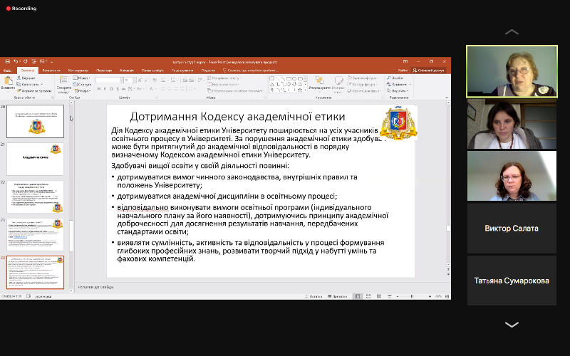 Світлана Усатюк детально зупинилася на дотриманні Кодексу академічної етики НУХТ в освітньому процесі, навела нормативно-правові документи щодо академічної етики.