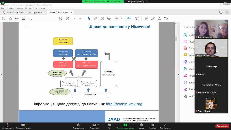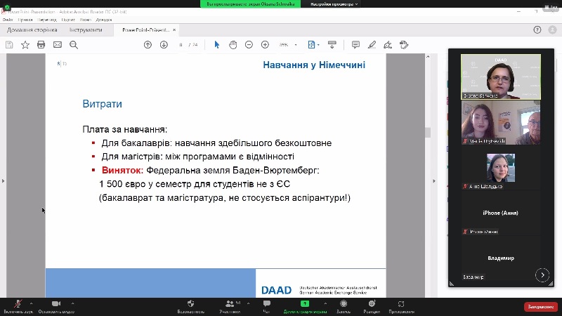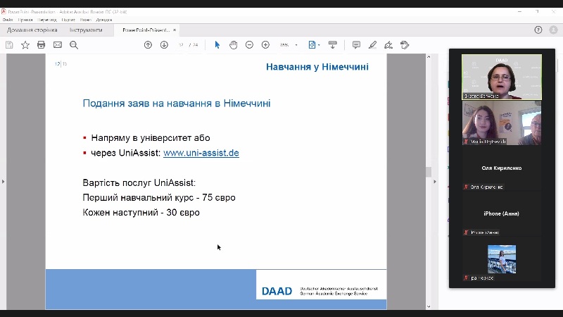 Фахівчиня розповіла про умови участі в програмі міжнародних обмінів (вимоги до знання іноземної мови, правила підготовки та подання пакету документів) і конкурси на отримання стипендій DAAD. Корисною була інформація про офіційні сайти, на яких можна більш детально ознайомитися з можливостями академічної мобільності в закладах вищої освіти Німеччини. Учасників зацікавили питання щодо особливостей участі в таких програмах для здобувачів різних освітніх ступенів, умов проживання під час навчання в закладах вищої освіти Німеччини тощо. На всі запитання спікерка надала ґрунтовні відповіді.