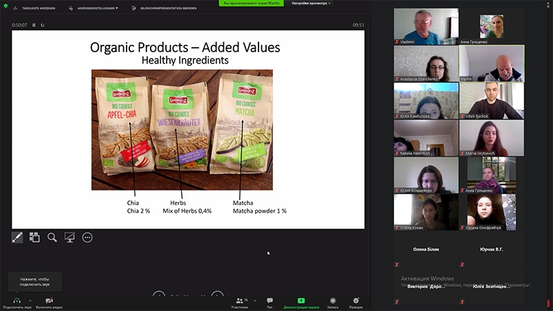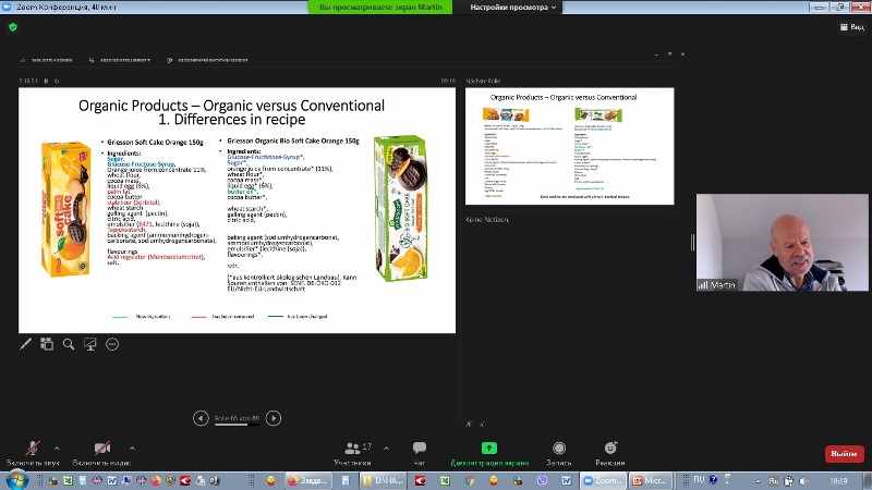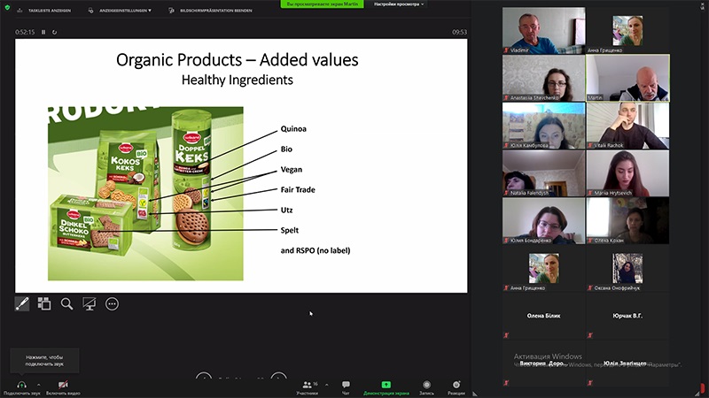 Детально розглянувши питання сертифікації органічного виробництва в різних країнах світу, лектор звернув увагу на маркування та його особливості, які можуть бути прийняті в кожній країні. Фахівець проаналізував світовий ринок органічних продуктів і його тенденції, обсяги виробництва та споживання в різних країнах світу, вартість продукції. Корисною була інформація щодо особливостей рецептур хлібобулочних і кондитерських виробів із урахуванням вимог до органічних продуктів та організації процесу їх виробництва.
