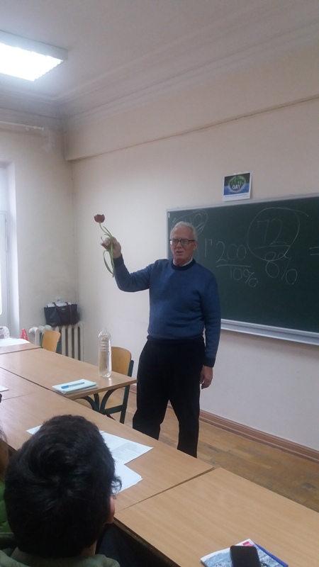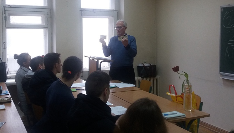Томас Стівенс говорив зі студентами про форми грошей, вартість, про відмінність між абсолютною та відносною вартістю, бартер, які товари використовувалися у функції грошей та ін. Пояснення відбувалося з використанням цікавих наочних матеріалів і навіть справжніх продуктів.