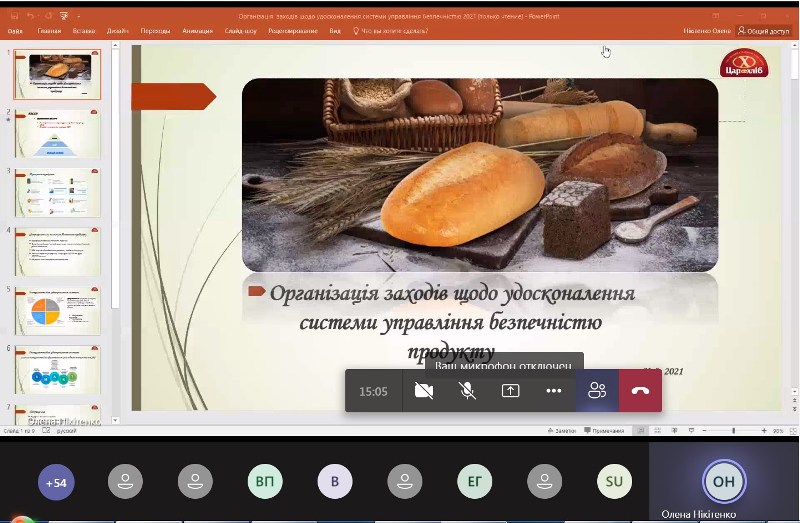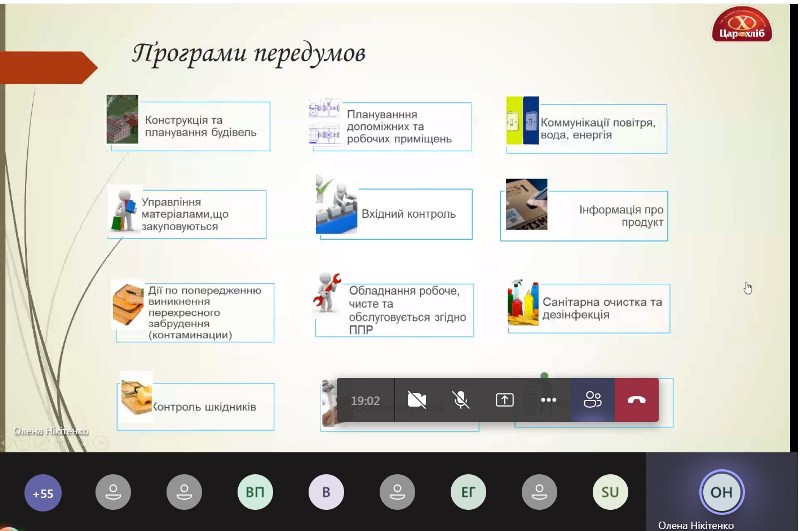 Під час заняття були роз’яснені основні питання законодавчих вимог щодо запровадження програм-передумов на хлібозаводі та охарактеризовані заходи щодо їхнього удосконалення, висвітлені питання організації системи простежуваності продукції та розроблення процедури відкликання невідповідної продукції та її вилучення. При викладені матеріалу фахівчиня-практик акцентувала увагу здобувачів на важливості впровадження систем управління безпечності на підприємствах із виробництва харчових продуктів і неодноразово наголошувала на важливості підготовки персоналу до впровадження системи і його постійного навчання при її функціонуванні.