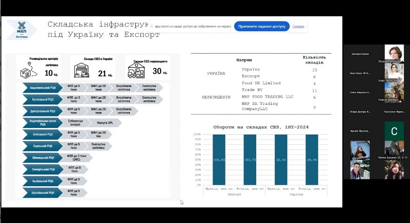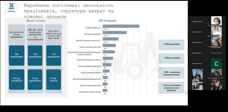 На ПрАТ «МХП» логістичні перевезення поділяють на експортні, операційні, виробничі. Експортна логістика забезпечується власною експедиторською компанією, що опікується безпечністю постачання виробленої продукції за кордон. Операційну логістику здійснюють 10 розподільчих центрів, які функціонують у регіонах та на яких упроваджені системи управління безпечністю, що базуються на принципах НАССР. Виробнича логістика – забезпечення всіх етапів і процесів виробництва сировиною, напівфабрикатами тощо. Також фахівчиня зупинилась на питаннях безпечного функціонування як логістичних центрів, так і забезпечення постачання до споживача безпечної харчової продукції.