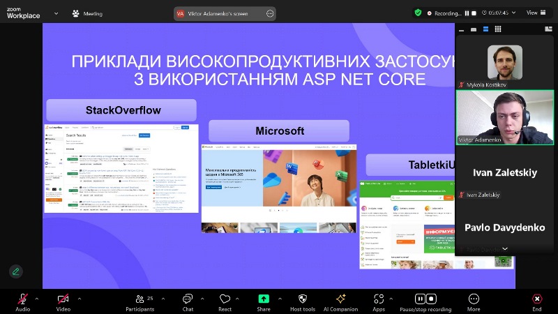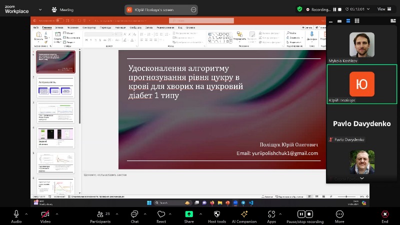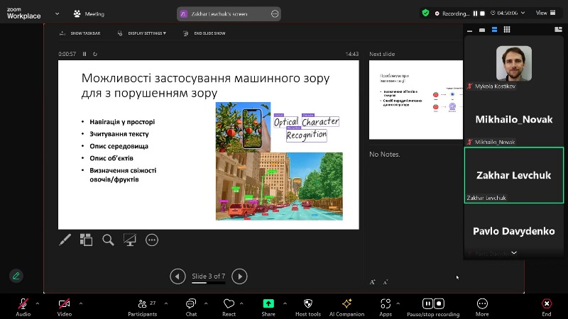 Далі заслухали виступи фахівців із інших установ і здобувачів освіти. Обговорювалося застосування штучного інтелекту в різних сферах життя, нейромережі та машинне навчання, інтелектуальний аналіз даних, комп'ютерний зір і навігація, автоматизація та робототехніка, кіберзахист і безпека даних, математичне моделювання та прогнозування процесів, а також створення прикладних інформаційних систем.