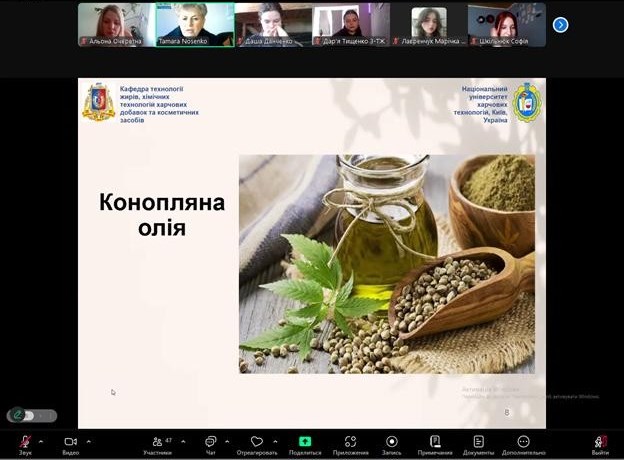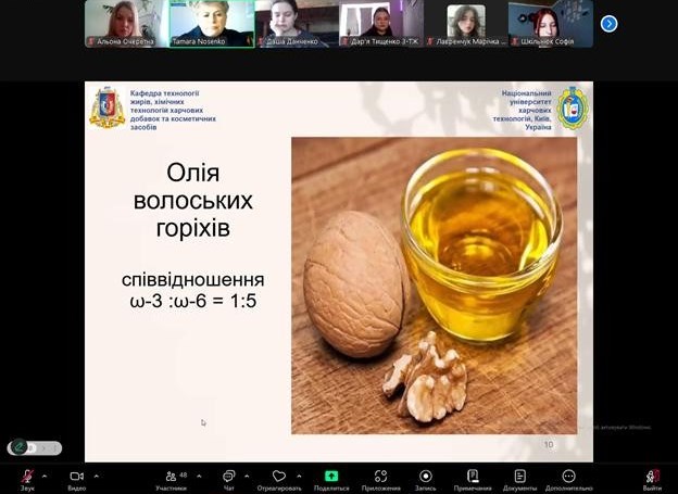 Завідувачка кафедри технології жирів, хімічних технологій харчових добавок та косметичних засобів Тамара Носенко презентувала гостьову лекцію «Рослинні олії і жири для здорового харчування» здобувачам освіти Івано-франківського фахового коледжу ресторанного сервісу і туризму НУХТ і Вінницького фахового коледжу НУХТ.