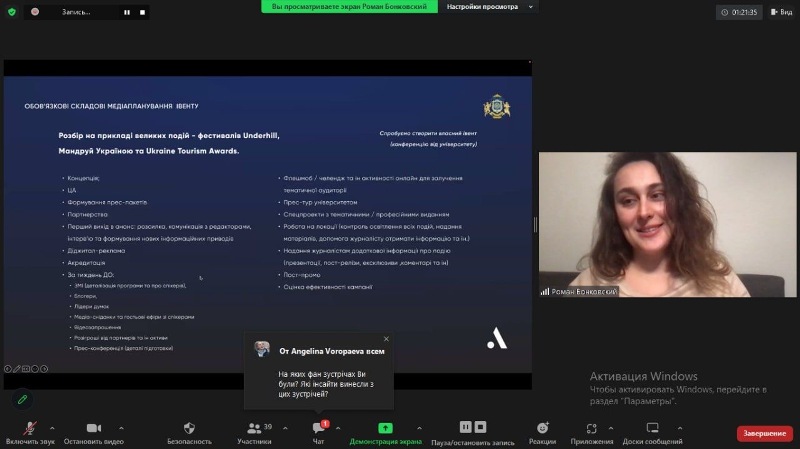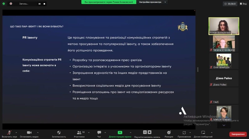 Під час лекції в форматі питання-відповідь здобувачі освітніх ступенів «бакалавр» і «магістр» змогли дізнатися про тонкощі роботи піарника на майданчику події, особливості комунікацій з партнерами, використання лайфхаків на прикладі конкретних реалізованих проєктів.