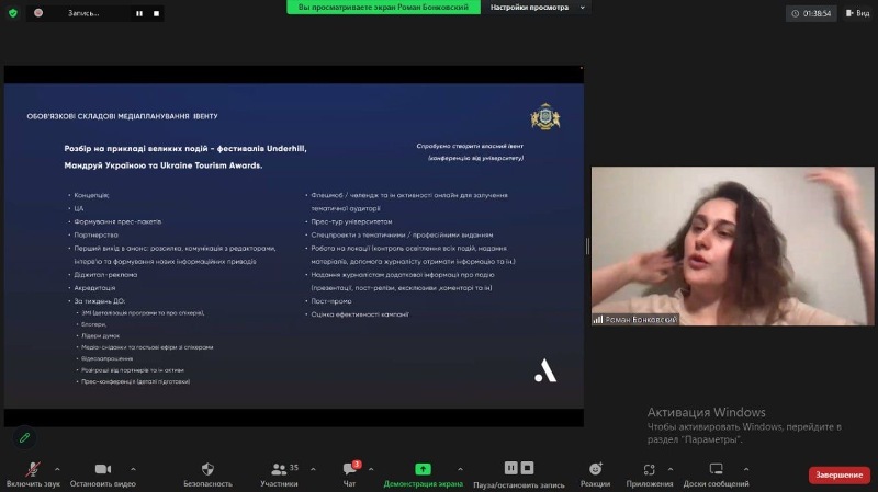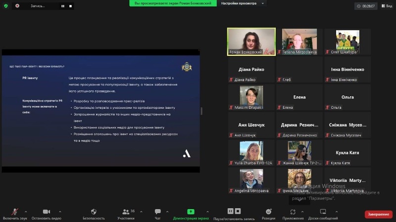 Лекторка поділилася зі здобувачами реальними кейсами та розповіла на прикладі конкретних проєктів про тонкощі роботи піарника в івент-індустрії. Серед основних тем обговорили: які бувають івенти в піарі, етапи планування івенту, основи розроблення медіаплану, особливості роботи з партнерами, спонсоринг, організацію роботи в день події, пост-піар івенту, правила піар-звітності.