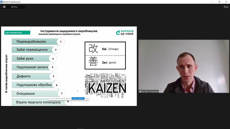 Спікер продемонстрував учасникам лекторію результативність інструментів Бережливого виробництва – Lean Manufacturing та основи методології Кайдзен (Kaizen). Були представлені практичні результати, які відображали проблеми реального виробництва і методи їх вирішення на базі п'яти принципів Lean. Широке коло дискусій було викликано різними думками щодо підходів під час формування процесів безперервного вдосконалення бізнесу і виробництва. Фахівець навів приклади до сприйняття виробництва як комплексу процесів із усуненням втрат, оптимізації робочих операцій. Дмитро докладно розкрив підґрунтя системи аналізу загальної ефективності роботи обладнання, призначеної для контролю та підвищення ефективності виробництва і заснованої на вимірюванні та обробленні конкретних виробничих показників.
