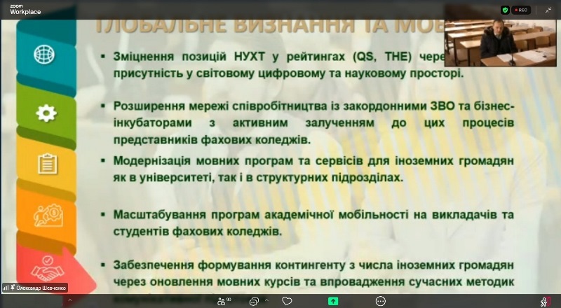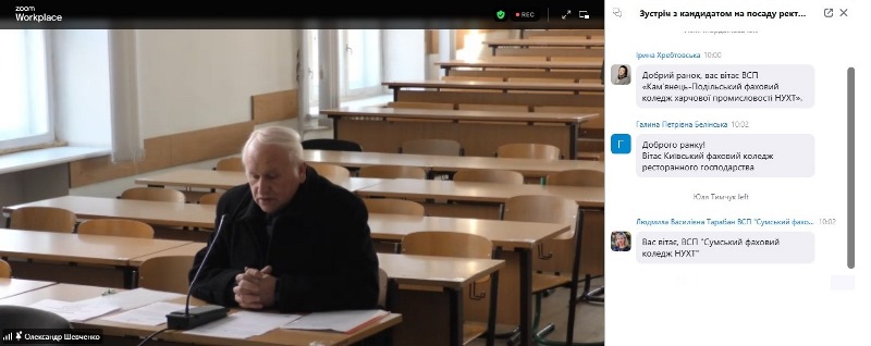 Підготовка до проведення виборів ректора університету вийшла на фінішну пряму. Списки виборців уже передані Організаційним комітетом до Головної виборчої комісії і регіональних виборчих комісій. Не раніше, як за 20 і не пізніше, як за 12 годин до початку виборів будуть виготовлені бюлетені для голосування у кількості, що відповідає кількості осіб, які мають право брати участь у виборах і включені до відповідного списку виборців. А поки що сьогодні відбулася зустріч працівників і здобувачів освіти фахових коледжів НУХТ із кандидатом на посаду ректора, професором Олександром Шевченком. З огляду на нинішні обставини, був обраний дистанційний формат спілкування. Це дало можливість зібрати у онлайн-просторі викладачів, співробітників і студентів усіх одинадцяти відокремлених структурних підрозділів нашого навчально-наукового комплексу з усіх куточків України.