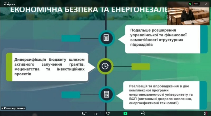 Кандидат наголосив, що кожна його ціль – це комплекс завдань, які він прагне втілити спільно з колективом навчально-наукового комплексу університету, адже тільки всі разом, як це було завжди, ми здатні долати будь-які труднощі й відкривати нові етапи розвитку, трансформуючи наш заклад вищої освіти у сучасний інноваційний хаб. Після презентації своєї програми, він запропонував вносити пропозиції для розвитку співпраці та відповів на запитання присутніх.