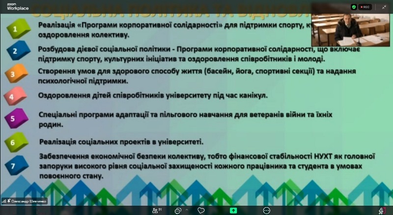 Далі кандидат навів коротку біографічну довідку, ознайомив учасників зустрічі зі своїми особистими освітніми і науковими здобутками та представив свою програму подальшого розвитку НУХТ і його відокремлених структурних підрозділів, зазначивши свої цілі й завдання на посаді керівника навчально-наукового комплексу.