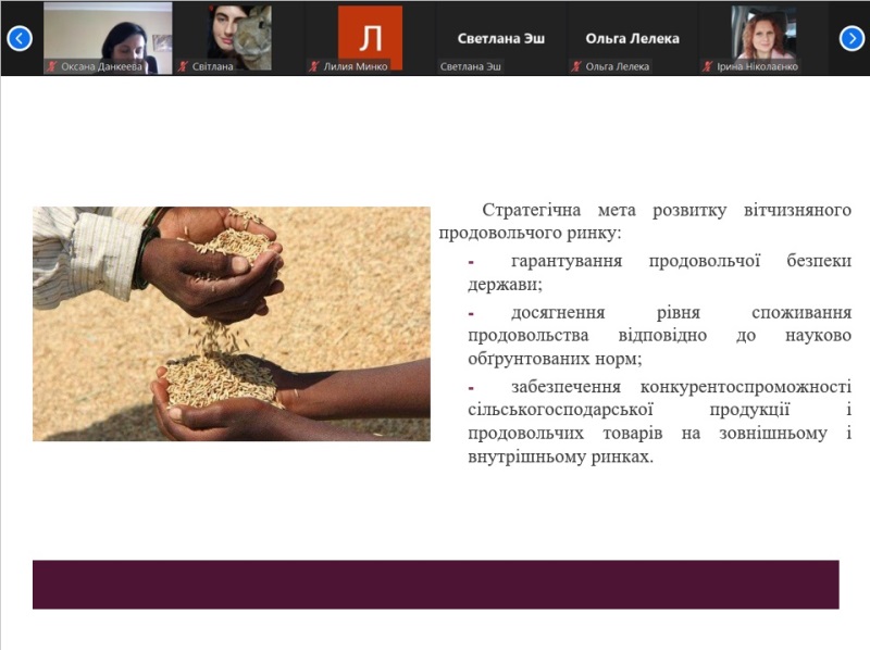 У ході відкритого заняття здобувачі ознайомились із основними поняттями та особливостями продовольчого ринку, показниками оцінювання його ефективності та основними оціночними критеріями рівня продовольчої безпеки, забезпечення якої є основною ціллю розвитку продовольчого ринку.