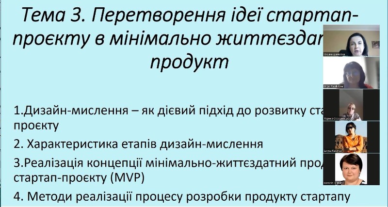 Відкрита лекція Оксани Данкеєвої «Перетворення ідеї стартап-проєкту в мінімально життєздатний продукт» з навчальної дисципліни «Управління стартап-проєктами» для здобувачів освітнього ступеня «Магістр» відбулася 4 жовтня. Лекторка ознайомила присутніх із алгоритмом вирішення споживацьких проблем із використанням нестандартних підходів, інноваційних рішень – методом дизайн-мислення. На численних прикладах було розглянуто використання цього методу провідними вітчизняними та іноземними компаніями. Викладачка акцентувала увагу на тому, що знання особливостей етапів методу дизайн-мислення дозволить перетворити ідею у мінімально життєздатний продукт.