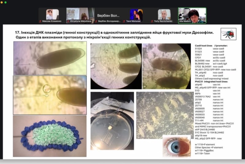 Особливу увагу Алла Мадіч приділила використанню фруктової мушки Drosophila Melanogaster як класичної, але надзвичайно актуальної моделі для генетичних досліджень та редагування геному. Слухачі дізналися про масштабну роботу сервісу мікроін'єкцій Кембриджського університету, який обслуговує міжнародну спільноту генетиків дрозофіли, забезпечуючи створення трансгенних ліній для сотень наукових проєктів. На прикладі дрозофіли було показано ефективність поєднання мікроін'єкційного методу з CRISPR/Cas9. Завершуючи розповідь про практичне застосування, лекторка торкнулася захоплюючої теми «контрольованої еволюції» – використання генних технологій для розв'язання глобальних проблем, як-от створення «бойових комарів» за допомогою бактерії Wolbachia для боротьби з малярією та іншими небезпечними захворюваннями.