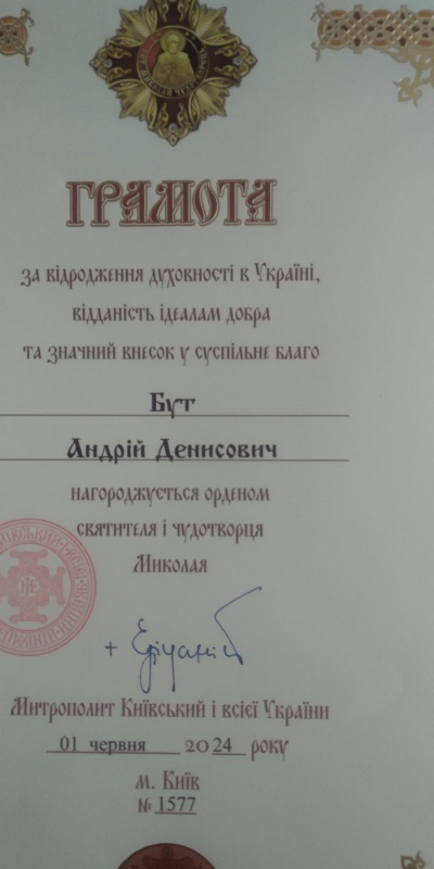Духовенство нагородило керівника студії естрадного співу Студентського центру патріотичного виховання та культурного розвитку Андрія Бута орденом святителя і чудотворця Миколая.