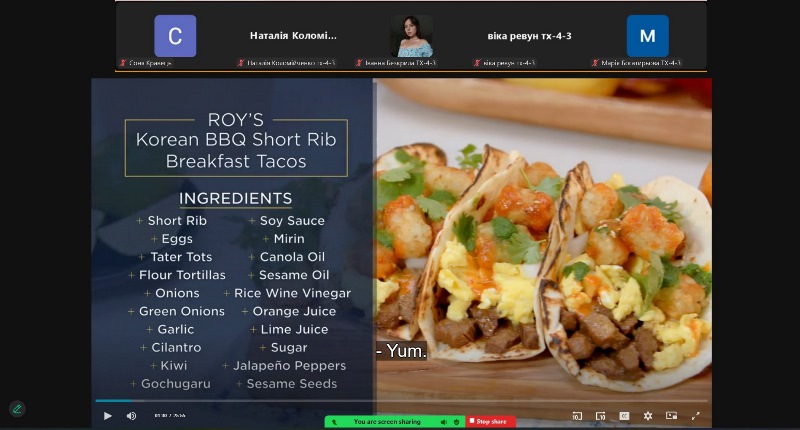 Студенти четвертого курсу освітньої програми «Технології харчування» долучилися до засідання кіноклубу, яке відбулося під керівництвом доцентки кафедри іноземних мов професійного спрямування Галини Лук’янець. Цього разу зустріч була присвячена перегляду кулінарного телешоу за участі Селени Гомес і відомого шеф-кухаря Роя Чоя, під час якого глядачі мали змогу ознайомитися з особливостями приготування тако – популярної страви мексиканської кухні.