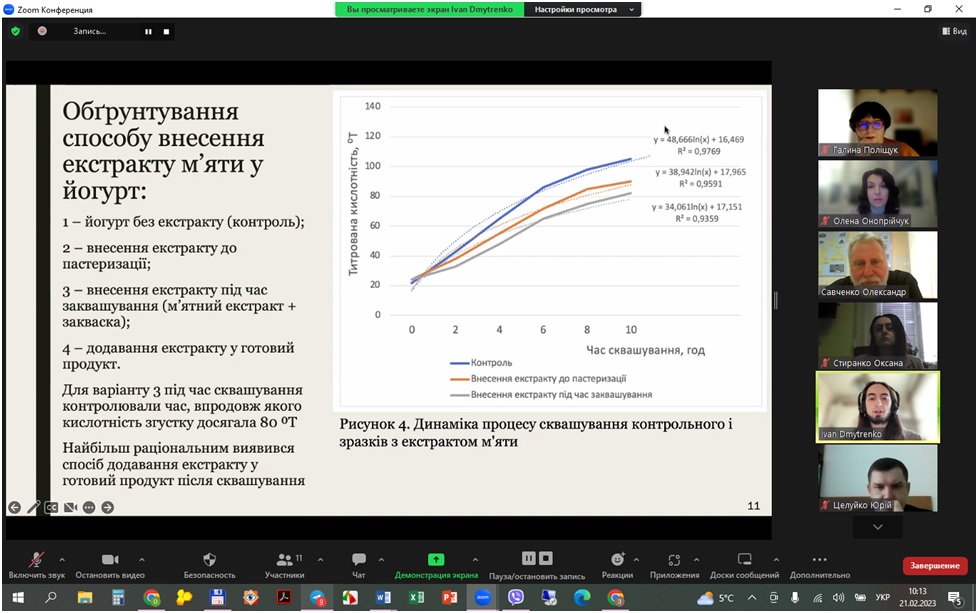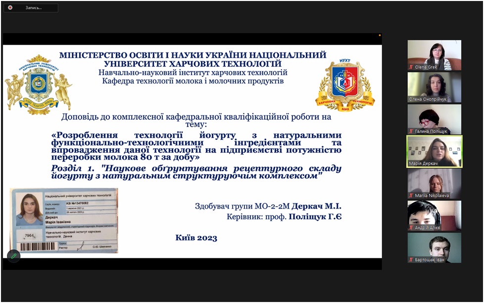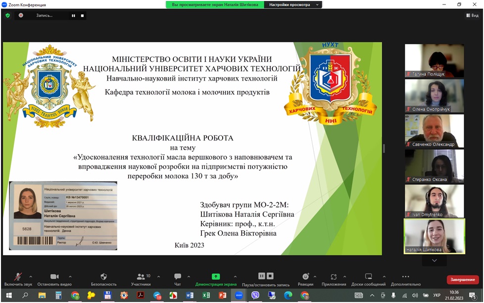 На кафедрі технології молока і молочних продуктів з 16 по 21лютого 2023 року з використанням сучасних інформаційно-комунікативних технологій відбулися успішні захисти здобувачів освітнього ступеня «Магістр» денної та заочної форми навчання, що навчалися за спеціальністю 181 «Харчові технології», освітньо-професійною програмою «Технології зберігання, консервування та переробки молока».