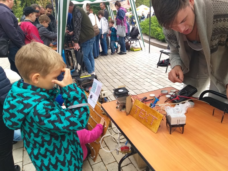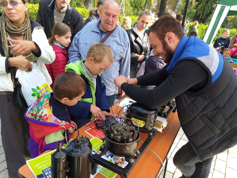 Відвідувачам нашої локації було запропоновано: ознайомитись із будовою поршневого та ротаційного компресора, спробувати визначити справний компресор, і здійснити його тестовий запуск, наживо побачити, що відбувається всередині випарника побутового холодильника, заморозити краплину води на напівпровідниковому термоелектричному модулі та за допомогою свічки і льоду виробити достатню кількість електроенергії для підсвічування абревіатури кафедри теплоенергетики та холодильної техніки – ТЕХТ, взяти участь у перегонах на робокарах.