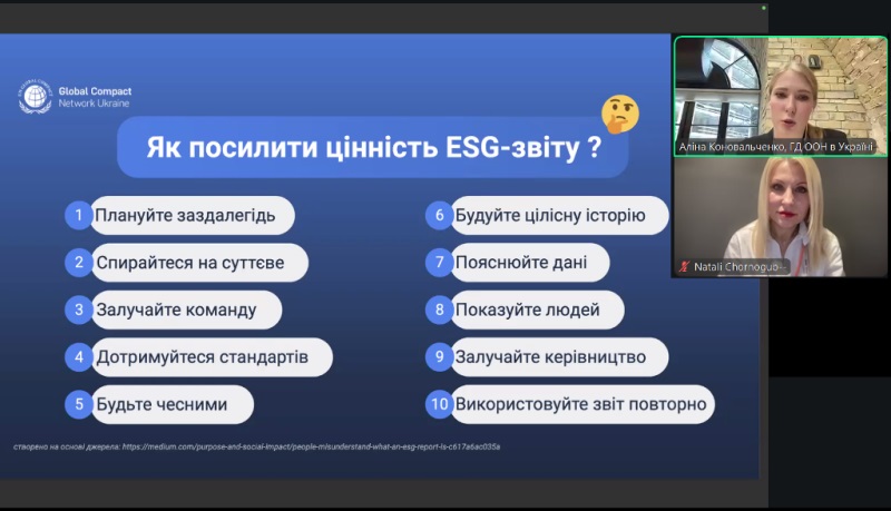 12 лютого у межах практичних занять з дисципліни «Нормативне забезпечення біотехнологічних виробництв» студенти-бакалаври освітньо-професійної програми «Біотехнології: фармацевтична, промислова, харчова, природоохоронна» разом із лекторкою курсу, доценткою Світланою Старовойтовою, деканкою факультету біотехнології та екологічного контролю Наталією Грегірчак і доценткою Оксаною Скроцькою долучилися до вебінару «ESG-звітність: що потрібно знати бізнесу вже зараз?».