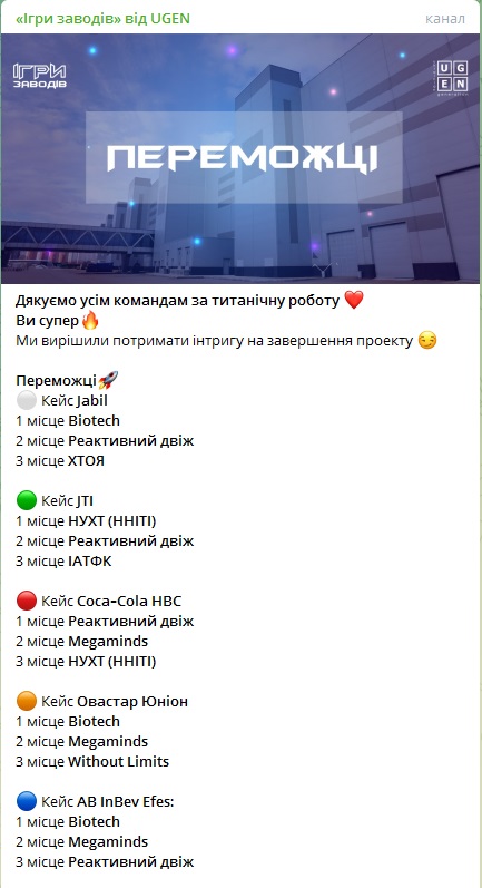 За результатами фінального етапу, проєкти команди «НУХТ (ННІТІ») в складі студентів кафедри технологічного обладнання та комп’ютерних технологій проєктування Олега Розумного (капітан), Володимира Валового та студентки кафедри електропостачання і енергоменеджменту Вікторії Ватилик (консультант – завідувач кафедри технологічного обладнання та комп’ютерних технологій проєктування, професор Микола Якимчук) зайняли перше місце по вирішенню практичних задач для компанії «JTI» і третє місце – для компанії «Coca Cola HBC».