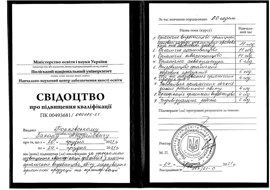 Випускник-магістр 2021 року освітньо-професійної програми «Технології органічних харчових продуктів» Захар Борковський пройшов підвищення кваліфікації, успішно склав тест із оцінкою «дуже добре» та отримав свідоцтво, яке є документом, що підтверджує компетенції у сфері органічного виробництва, обігу та маркування органічної продукції, що є передумовою для здавання іспиту на отримання свідоцтва інспектора з органічного виробництва та/або обігу органічної продукції.