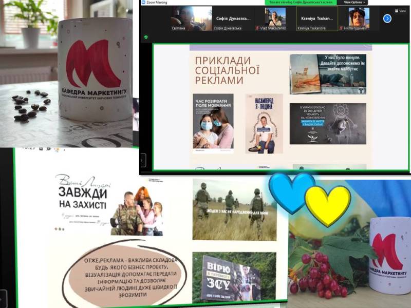 Друга частина засідання гуртка відбулася в онлайн-форматі. Майбутні маркетологи зібрались у вільний від пар час, щоб послухати актуальну на сьогодні тему «Копірайтинг та візуалізація у соціальній рекламі». Доповідачами були наші здобувачки Ксенія Цуканова та Софія Дунаєвська. В огляді некомерційних реклами і копірайтингу дівчата зачепили такі важливі теми, як толерантність до людей із особливими потребами, майбутнє дітей, які залишились без батьків, людей, що лишились без заробітку. А наприкінці доповіді здобувачі продемонстрували приклади соціальної реклами, присвяченої нашим Захисникам і Захисницям.