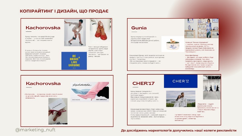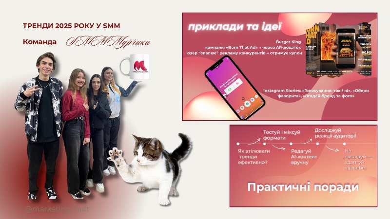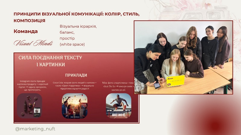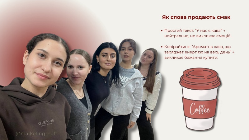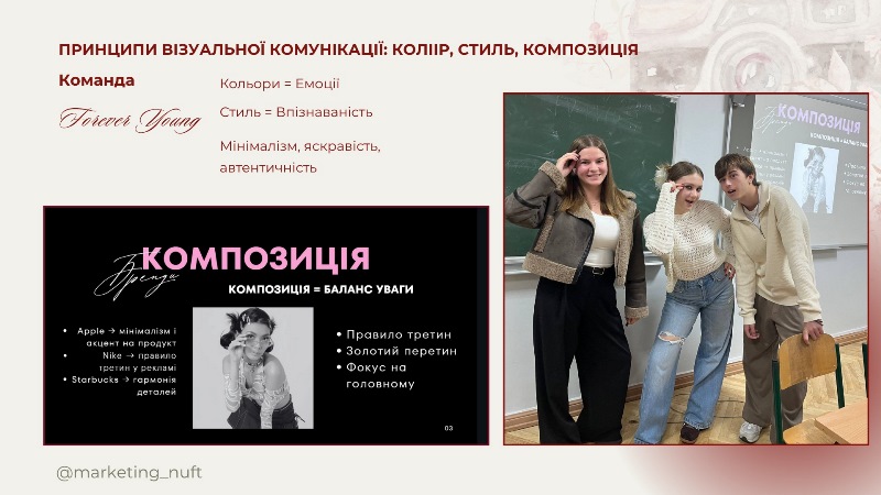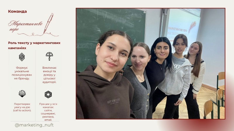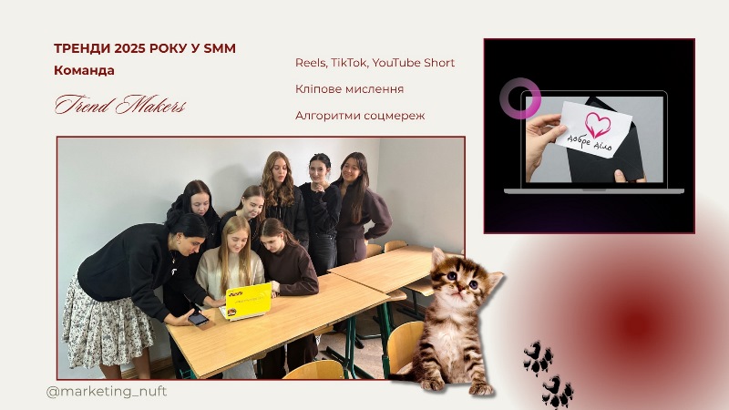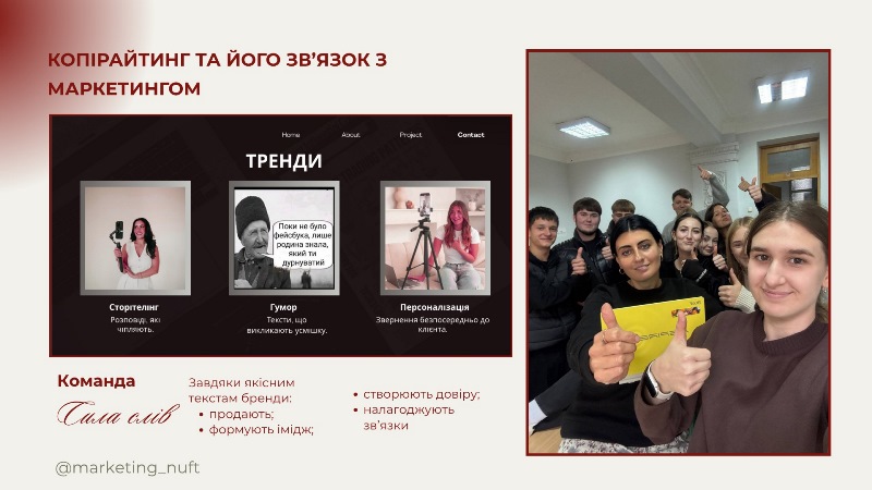 У першій частині засідання майбутні маркетологи представили результати своїх досліджень за трьома напрямами: «Копірайтинг та його зв’язок з маркетингом», «Принципи візуальної комунікації», «Тренди SMM 2025». А колеги-рекламісти доповнили маркетинговий драйв дослідженням дизайну сучасних українських брендів.