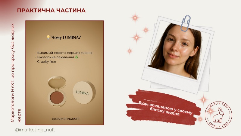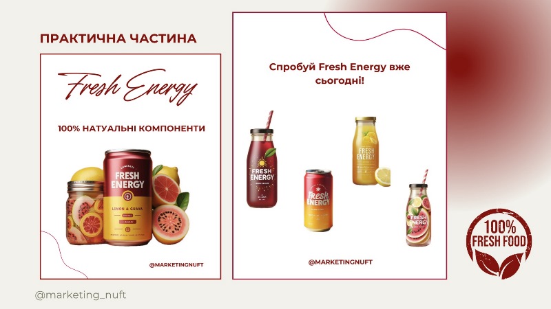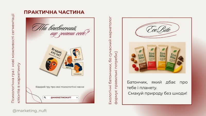 Після жвавої дискусії розпочалася друга частина зустрічі – те, що реально запалило серця слухачів і учасників. Кожна команда презентувала вирішення практичних кейсів: розроблення маркетингової пропозиції цінності у сфері, яку студенти обирали самі. Юні маркетологи охарактеризували власні проєкти, їхню цінність для споживачів, візію, позиціонування, ключові меседжі та «tone of voice». Візуальну концепцію брендів майбутні гравці ринку представили у форматі каруселей для таргетингу в Інстаграм як приклади реалізації SMM-кампаній із виведення брендів на ринок.