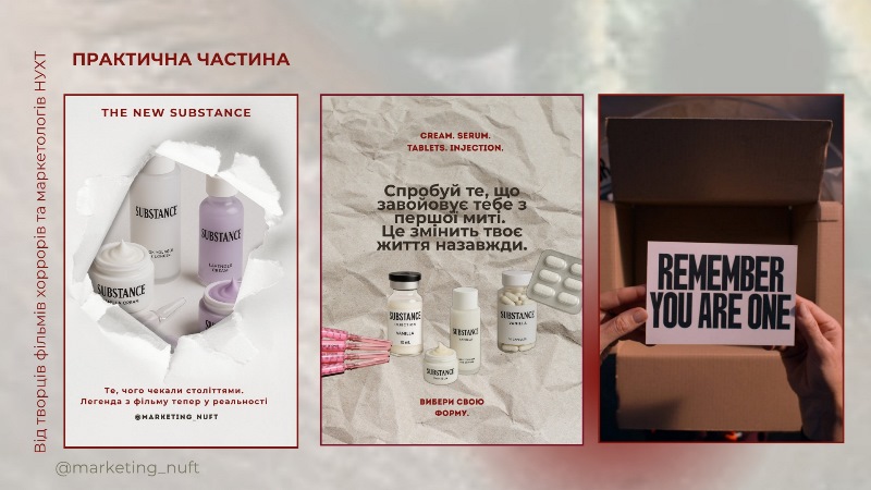 Серед проєктів були психологічна гра «Вгадай, хто ти», екологічні батончики «EcoBite», натуральні бренди етичної косметики «Lumina» і «Glow+», енергетичний напій «Fresh Energy» і досить неординарна маркетингова пропозиція «The New Substance», на яку студентів надихнув фільм «Субстанція» французької кінорежисерки і сценаристки Коралі Фаржі.