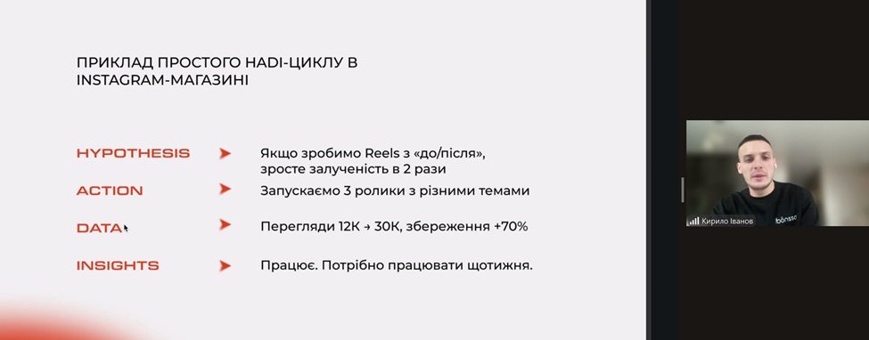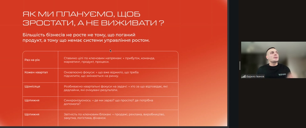 Спікер розкрив власну систему управління ростом: річне планування: цілі по прибутку, команді, маркетингу, продукту, процесах; квартальні фокуси: аналіз результатів і корекція стратегії; щомісячні задачі: дедлайни, відповідальні, очікувані результати; щотижнева синхронізація та звітність по ключових блоках.