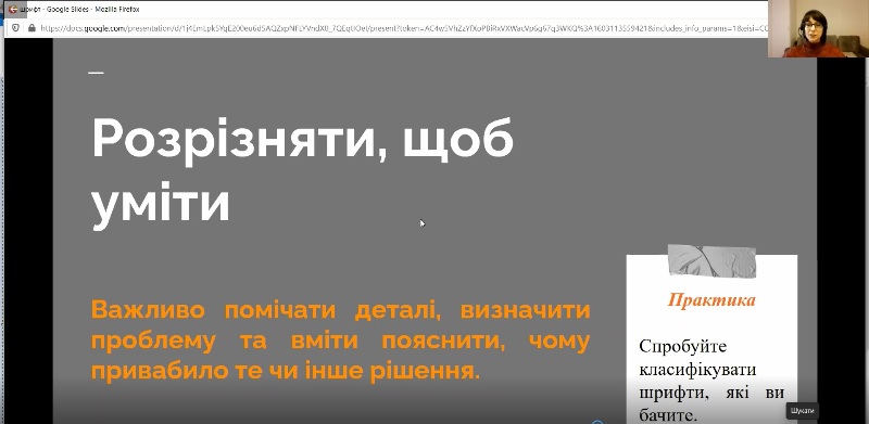 Викладачка розказала майбутнім рекламістам про особливості використання шрифтів при розробленні дизайну реклами. На численних прикладах показала характерні риси основних типів шрифтів, навчила вирізняти їх з-поміж інших, щоб добирати найбільш відповідні своїй меті, різновиду реклами та потребам аудиторії. Приділила увагу й такому важливому питанню, як дотримання авторських прав при використанні шрифтів.
