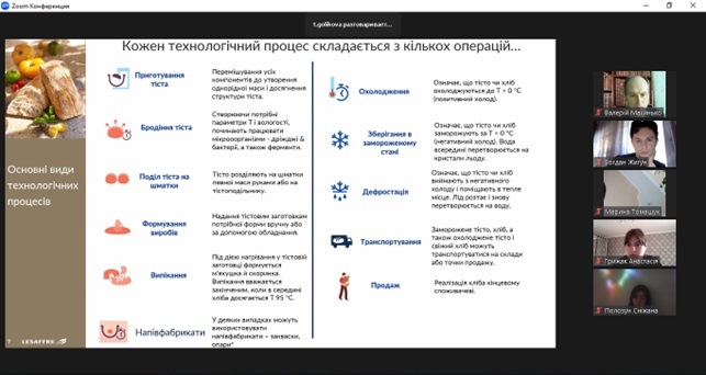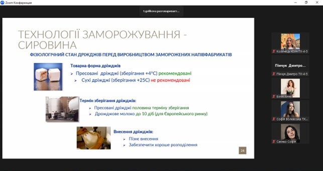 На кафедрі технології хлібопекарських і кондитерських виробів відбулася гостьова лекція технологині ТОВ «Лесаффр Україна» Тетяни Голікової на тему «Технологічні рішення компанії Lesaffre для заморожених напівфабрикатів». Лекція відбулася в рамках вивчення дисципліни «Низькотемпературні та екструзійні технології» для здобувачів освітнього ступеня «Бакалавр» спеціальності 181 «Харчові технології», освітньо-професійної програми «Харчові технології та інженерія».
