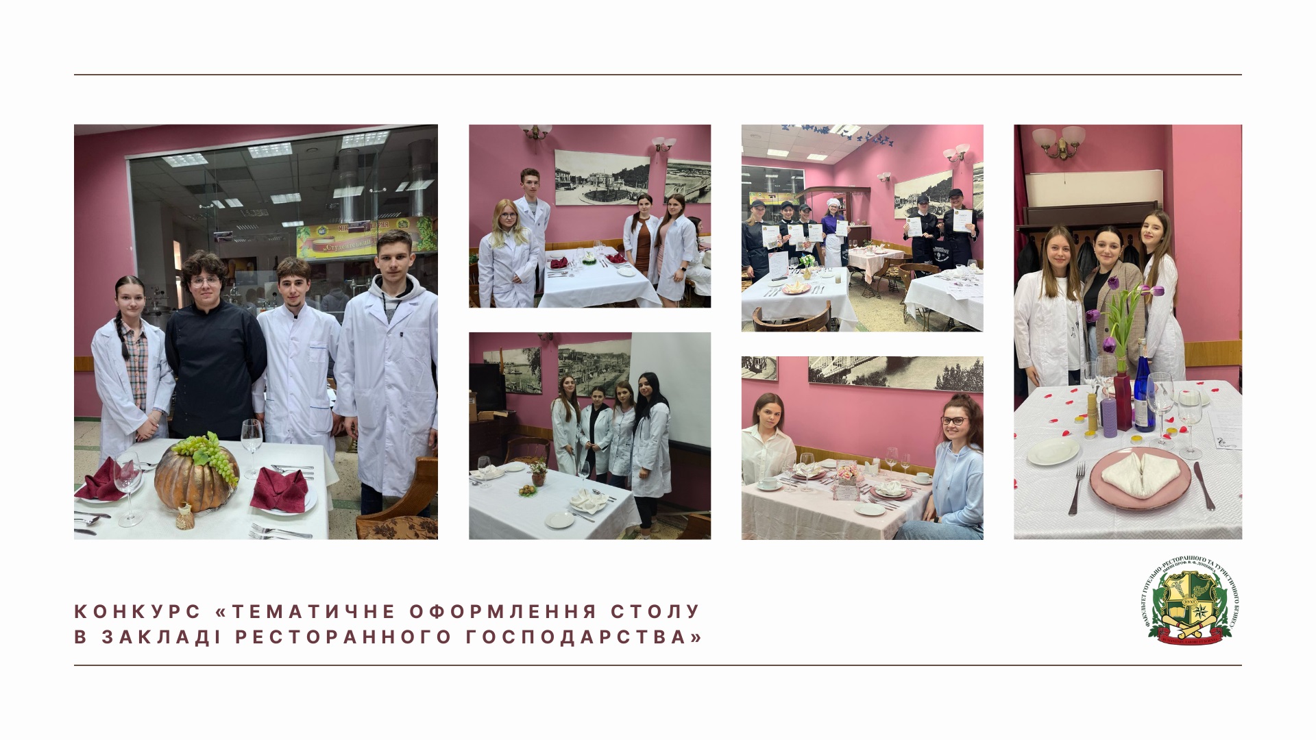 Майбутні фахівці з гостинності виважено підійшли до вибору свята, для якого запропонували тематичне оформлення столу. Підготували необхідний посуд і прибори, інвентар, декор, розробили святкове меню для ресторану. Викладачі кафедри готельно-ресторанної справи потрапили до обідньої зали закладу ресторанного господарства, де святково були оформлені столи до світлого свята Великодня, Дня матері, річниці весілля, Нового року, Дня святого Валентина, Дня народження, 8 Березня, Хелловіну, романтичної вечері, Дня подяки, Івана Купала, Білого дня в Японії.