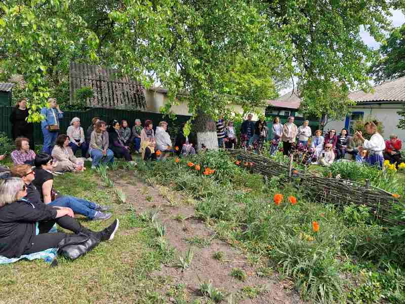 Далі відбулася глибока та прониклива екскурсія садибою-музеєм Катерини Білокур. Екскурсанти, розташувавшись прямо на траві серед квітів біля хати художниці, уважно слухали розповідь пані Ольги Шаповал про життя та творчий шлях видатної народної художниці.