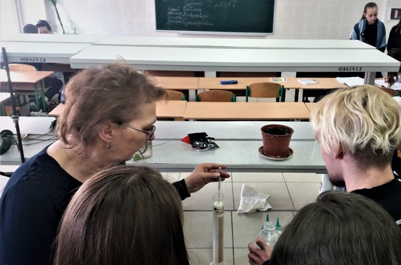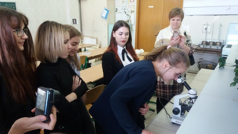 Професор Галина Поліщук розповіла про принцип роботи мікроскопа, за допомогою якого школярі вивчили мікроструктуру молока питного.