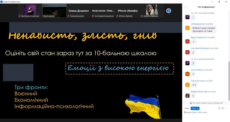 Протягом зустрічі відбувалась активна комунікація спікерки з аудиторією. Кожен студент мав змогу за 10-бальною шкалою оцінити свій рівень тої чи іншої емоції, висловити власну думку та задати запитання.