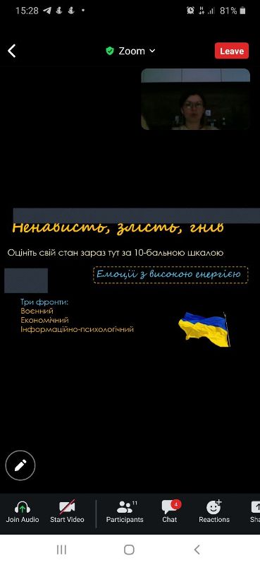 Цікаво було дізнатися, що на війні немає правильного рішення, адже події дуже швидко змінюються. Спочатку потрібно допомогти психологічно собі, а потім вже іншим. Не варто приймати зараз важливих рішень, наприклад. розлучатися або звільнятися з роботи, тому що ми живемо між першими двома рівнями піраміди Маслоу – фізіологічними потребами і потребою у безпеці, через що нездатні раціонально мислити.