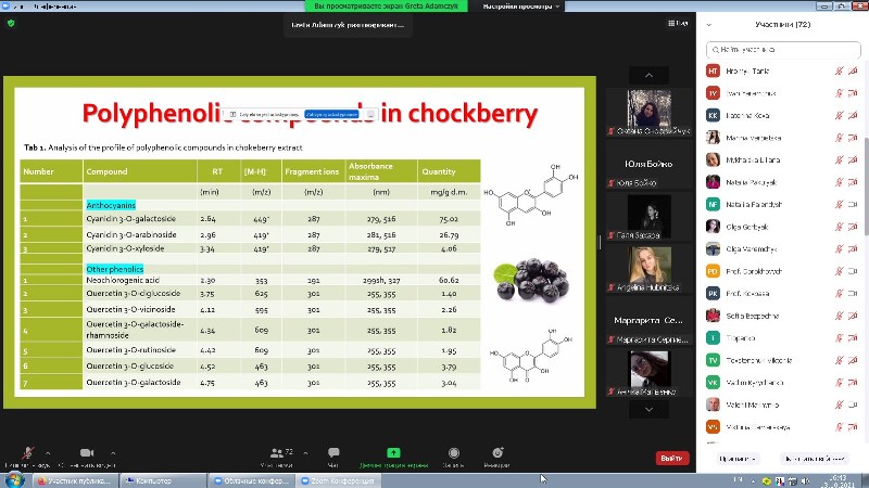 На кафедрі технології хлібопекарських і кондитерських виробів у онлайн-форматі відбулася гостьова лекція «Effect of extract from chokeberry on the properties of stored potato starch gels» доцентки Жешувського університету (Польща) Грети Адамчик для здобувачів освітнього ступеня «Магістр», освітніх програм «Технології хліба, кондитерських, макаронних виробів та харчоконцентратів» і «Технології органічних харчових продуктів» у рамках вивчення дисциплін «Інновації в технологіях борошняних, кондитерських виробів та харчоконцентратів», «Практичні проблеми в технологіях борошняних, кондитерських виробів та харчових концентратів» і «Основні принципи та вимоги до органічних харчових продуктів». До лекції також долучилися здобувачі вищої освіти освітнього ступеня «Бакалавр», освітньої програми «Харчові технології та інженерія», для яких інформація стала корисною в рамках вивчення дисципліни «Технології харчових концентратів».
