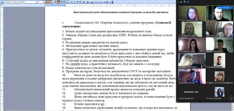Основні питання, що були розглянуті: унікальність освітньої програми «Технології харчування», яка підтверджується поглибленою теоретичною, практичною та науково-дослідною підготовкою здобувачів; відповідність цілей освітньої програми місії та стратегії університету, що відповідає меті НУХТ, зазначеній у пункті 3.1.1 «Положення про організацію освітнього процесу в Національному університеті харчових технологій», а також стратегічній меті і місії НУХТ, визначеним Стратегічним планом розвитку університету на 2021-2025 роки; відповідність компетентностей і програмних результатів вимогам Стандарту вищої освіти; дотримання академічної доброчесності; результати опитування здобувачів щодо поліпшення освітнього процесу.