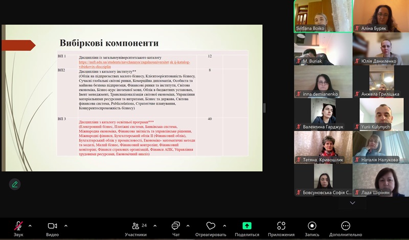 На кафедрі фінансів відбулася робоча зустріч зі стейкхолдерами, здобувачами освіти та представниками наукової спільноти в рамках локального моніторингу освітньо-професійних програм «Фінанси, банківська справа та страхування» першого (бакалаврського) та другого (магістерського) рівнів вищої освіти за спеціальністю 072 «Фінанси, банківська справа, страхування та фондовий ринок». Зустріч проводилася в онлайн-режимі.