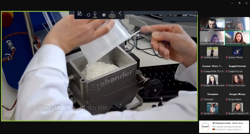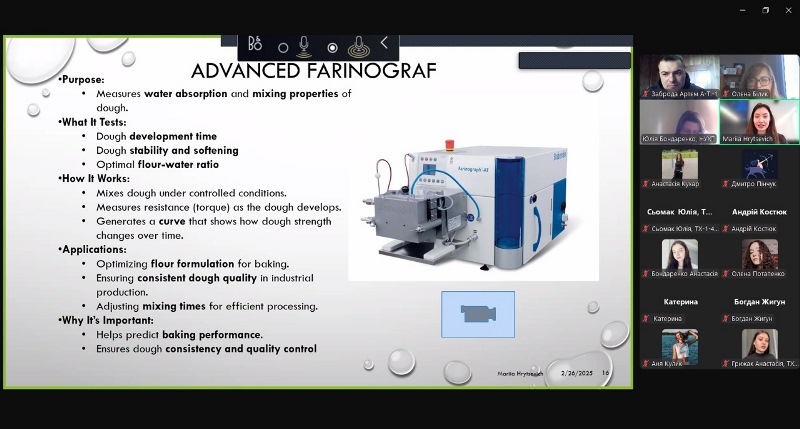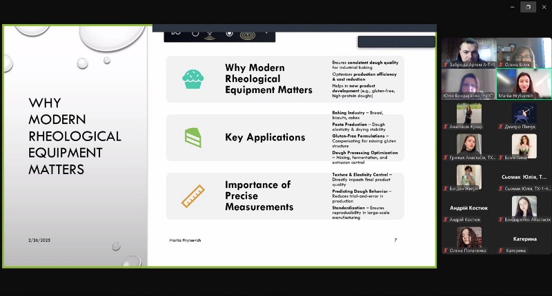 Заняття було присвячене вивченню реологічних характеристик харчових систем і проведене англійською мовою. Викладачка детально ознайомила студентів із принципами роботи таких приладів, як фаринограф, альвеограф, екстенсограф, реотест, пояснивши їх призначення та особливості застосування в аналізі структурно-механічних властивостей тіста. Заняття супроводжувалося демонстраційними відео, які не лише ілюстрували процес проведення досліджень на зазначених приладах, а й допомагали студентам краще зрозуміти принципи інтерпретації отриманих результатів, їх вплив на якість кінцевого продукту та практичне застосування у виробничих умовах.