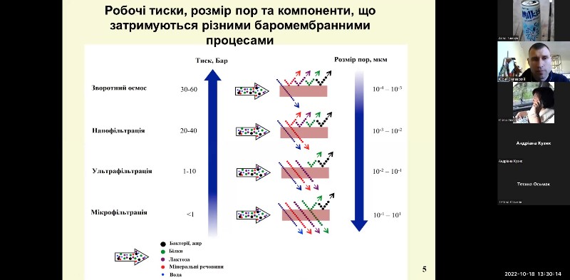 Лектор виклав науково обґрунтований підхід щодо принципів проведення мембранних процесів, зокрема баромембранних й електродіалізу та сфери їх застосування у молочній промисловості. Лекція викликала велику зацікавленість учасників.