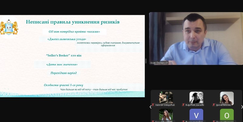 На кафедрі економіки і права відбулася відкрита лекція професора Андрія Данкевича на тему «Процедура та оцінка придбання об'єкта інвестування» для здобувачів освітнього ступеня «магістр» першого року навчання, на яку були запрошені колеги та всі охочі.