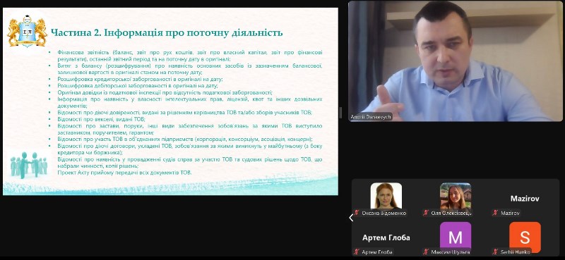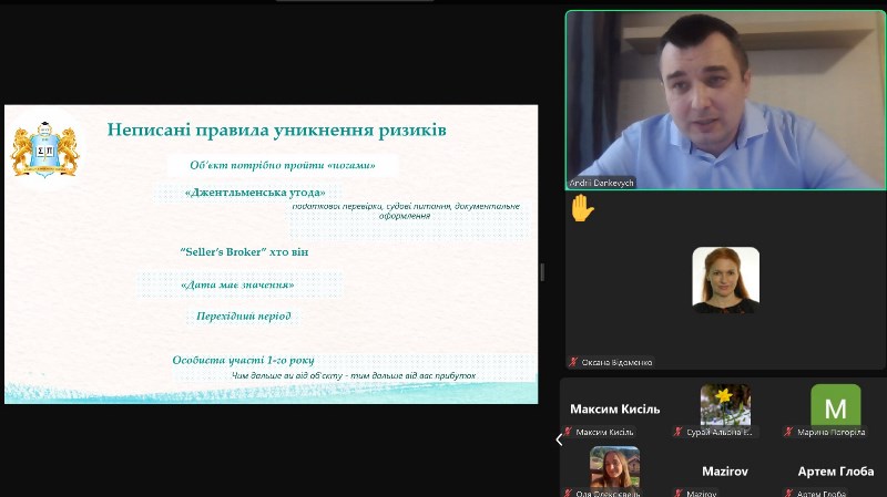 Були розглянуті ключові аспекти інвестиційної діяльності, методологія оцінювання інвестиційних об'єктів і практичні кроки придбання інвестиційних активів. Лектор поділився власним досвідом і рекомендаціями щодо ефективного управління інвестиційним портфелем на прикладі реальних суб’єктів бізнесу.