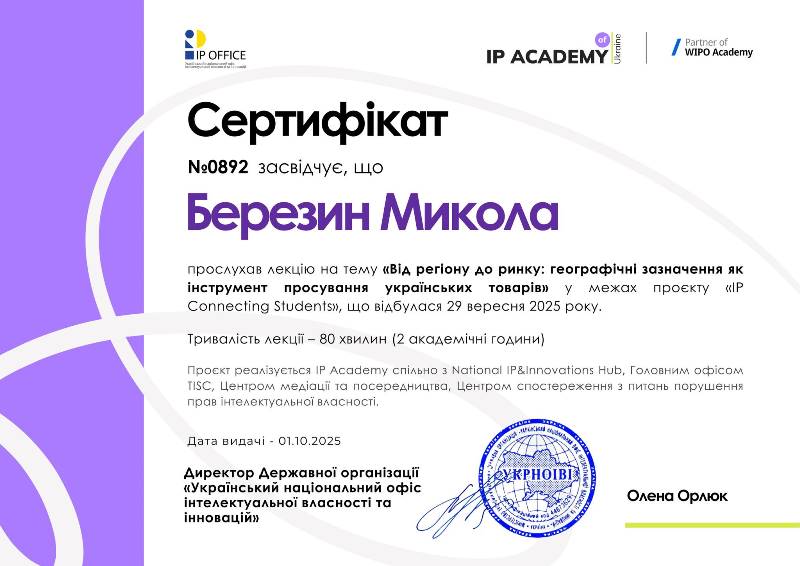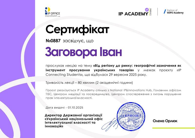 У межах вивчення дисципліни «Інтелектуальна та промислова власність» магістранти усіх освітніх програм Навчально-наукового інституту харчових технологій прослухали лекцію фахівців Національного офісу інтелектуальної власності та інновацій на тему «Від регіону до ринку: географічні зазначення як інструмент просування українських товарів».