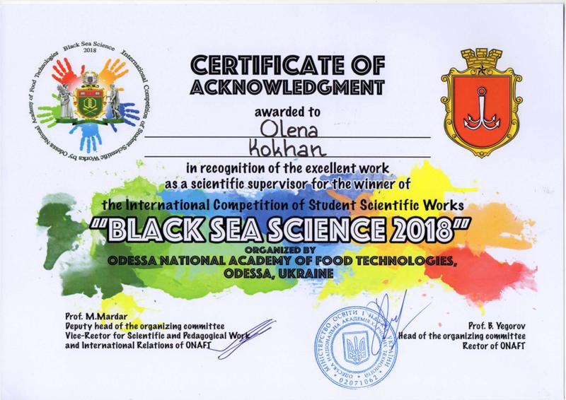 За результатами другого етапу конкурсу студентських робіт «Black Sea Science-2018» магістрантка Навчально-наукового інституту харчових технологій НУХТ Ірина Денисенко стала його призером та отримала сертифікат конкурсу за ІІІ місце.